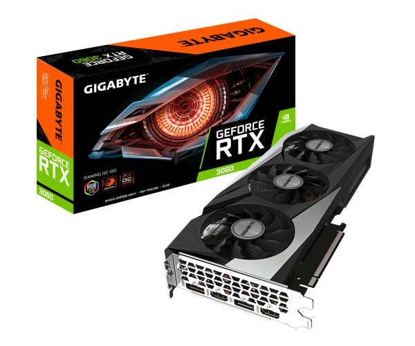 כרטיס מסך Gigabyte GeForce RTX 3060 Gaming OC 12GB (Rev 2.0) PCIe 4.0 LHR עם 12GB GDDR6 על ממשק 192-bit, מערכת קירור WINDFORCE 3X, ותמיכה ב-Ray Tracing ו-DLSS. כולל 2× HDMI 2.1 ו-2× DisplayPort 1.4a, חיבור חשמל 8-pin והגבלת כרייה LHR.