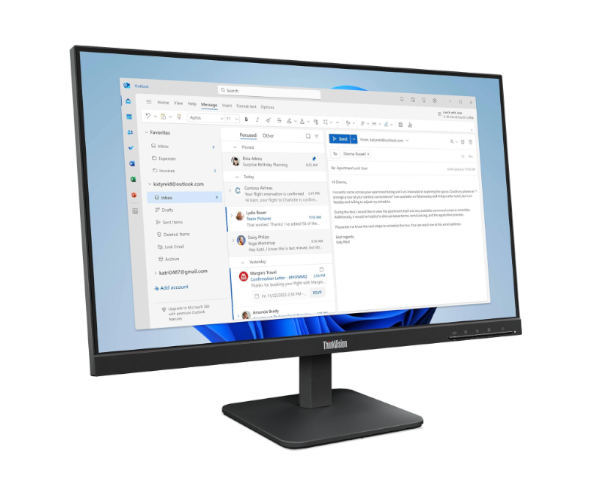 ThinkVision S24-4e 23.8" מסך IPS FHD עם קצב רענון 100Hz וזמן תגובה 4ms לשימוש יומי/משרד. כולל HDMI + VGA ותושבת VESA 100×100, אחריות 3 שנים.