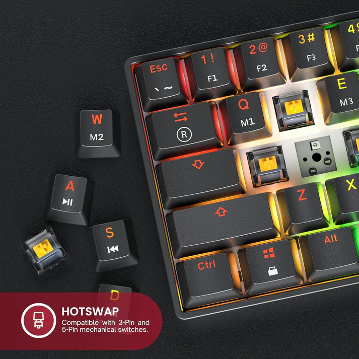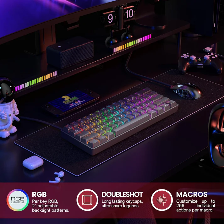 מקלדת גיימינג מכאנית חוטית 60% מבית HK GAMING, דגם GK61 בצבע שחור. כוללת מתגים מכאניים איכותיים ותאורת RGB בעיצוב קומפקטי ואלגנטי.